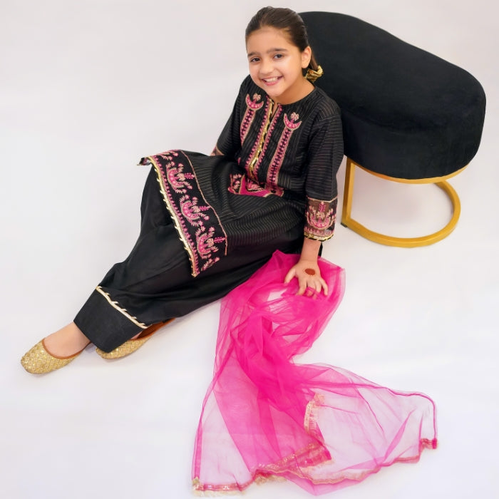 Drape yourself in timeless glamour with this black three-piece ensemble, featuring full sequin and heavy embroidery on the sleeves, neckline, and border, paired with a farshi shalwar and pink contrast dupatta.