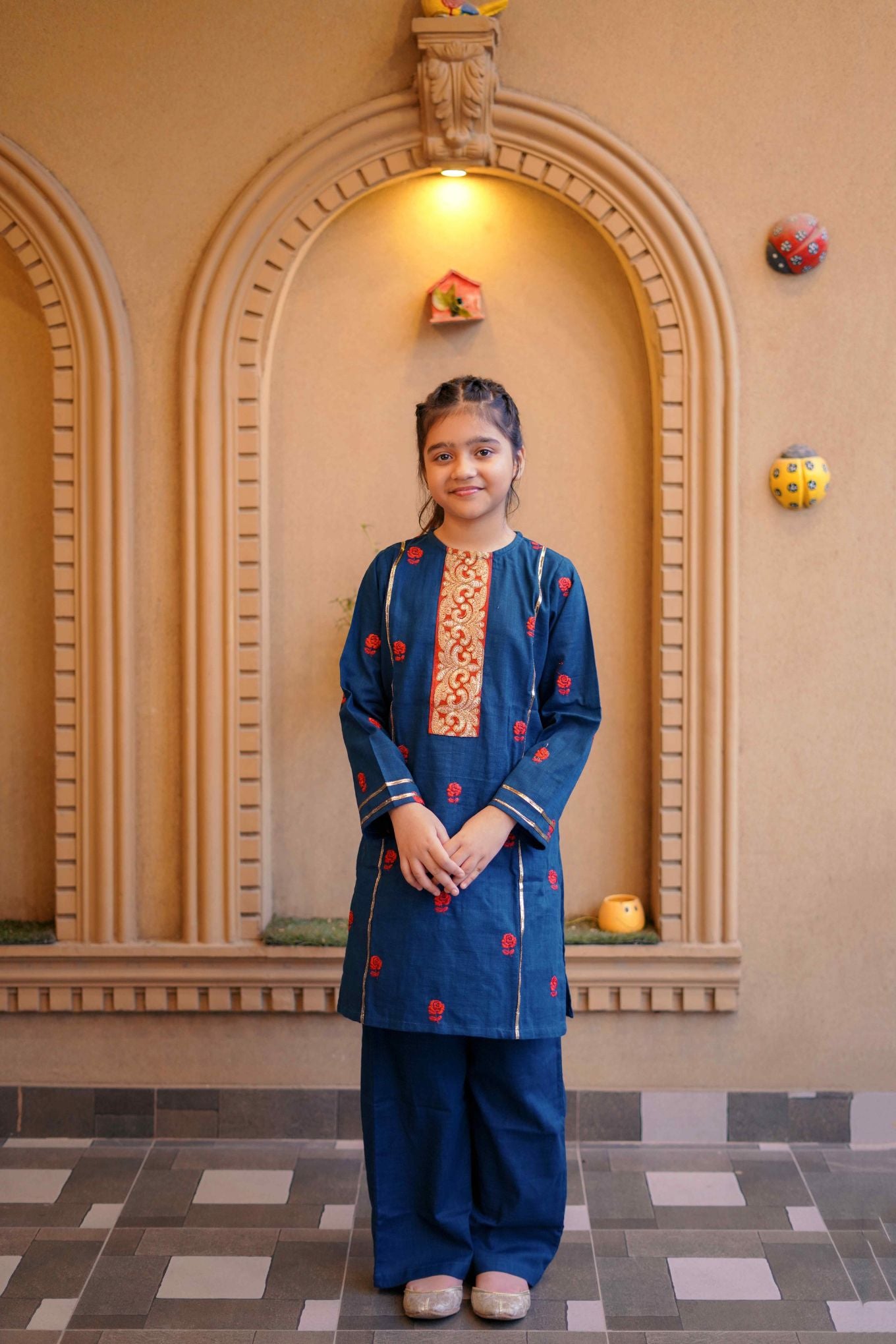 English blue embroidered with red thread , khaddar 2pc set.