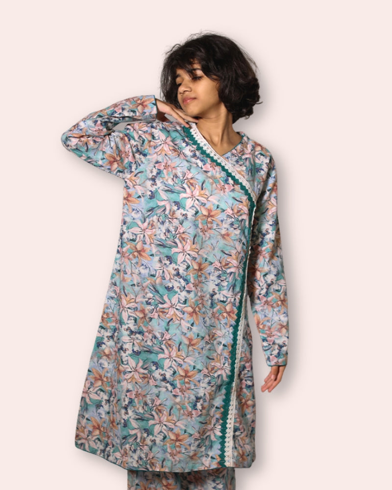 Elevate your wardrobe with this printed lawn angrakha-style twopiece cord set. Featuring intricate patterns and a flattering silhouette, it effortlessly blends tradition with modern flair.