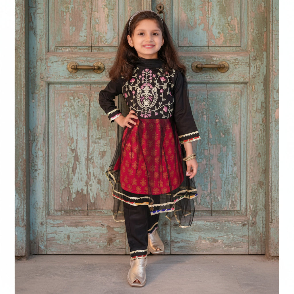 Elegant long frock with a half-body tilla embroidery, exuding regal charm. The black net ghaira is beautifully layered over pink thapa fabric, adding depth and contrast to the graceful silhouette.