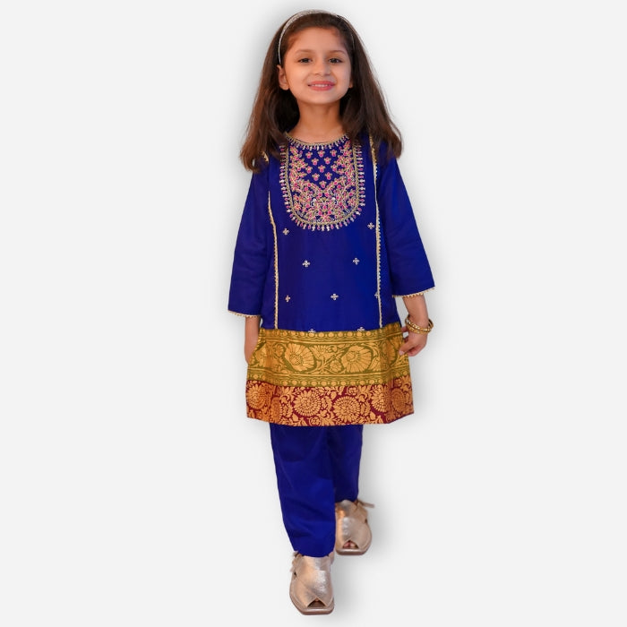 A majestic royal blue outfit richly embroidered with tilla and fuchsia-green thread, radiating regal charm. The screen-printed contrast border adds a striking finish, making it a perfect choice for festive occasions and grand celebrations.
