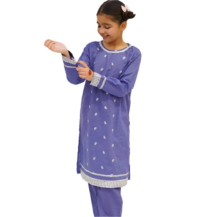 This elegant blue kurta trouser set features exquisite overall embellishments adorned with shimmering silver gotta. Perfect for festive occasions, it combines traditional charm with contemporary style for a stunning look.